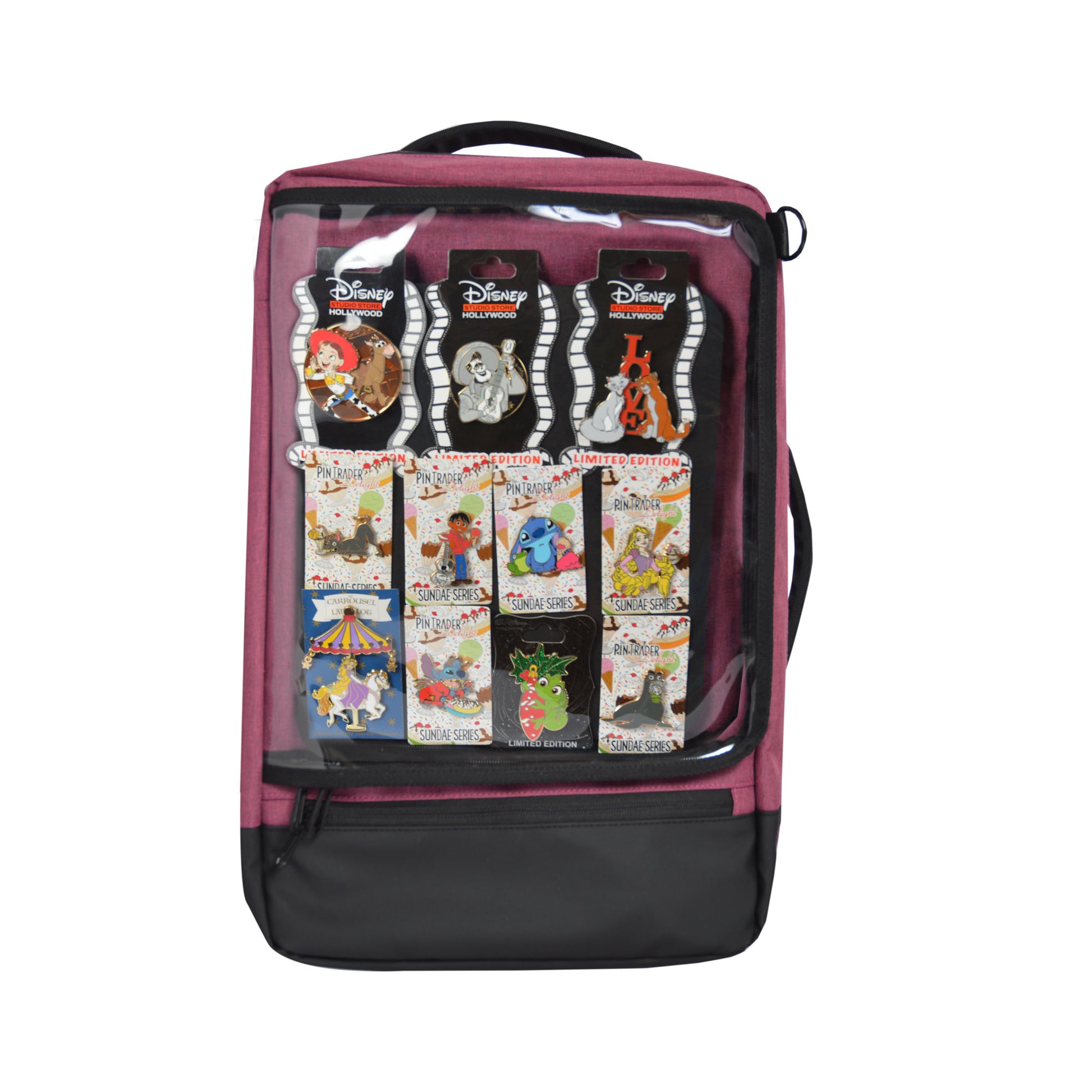 The only pin trading backpack you'll ever need ! Yes just one bag, not two. The Hydra features a major storage compartment for personal belongings and a front page compartment for an insert that holds pins on each side. With many pockets this is the bag that does it all, plus who doesn't like cup holders